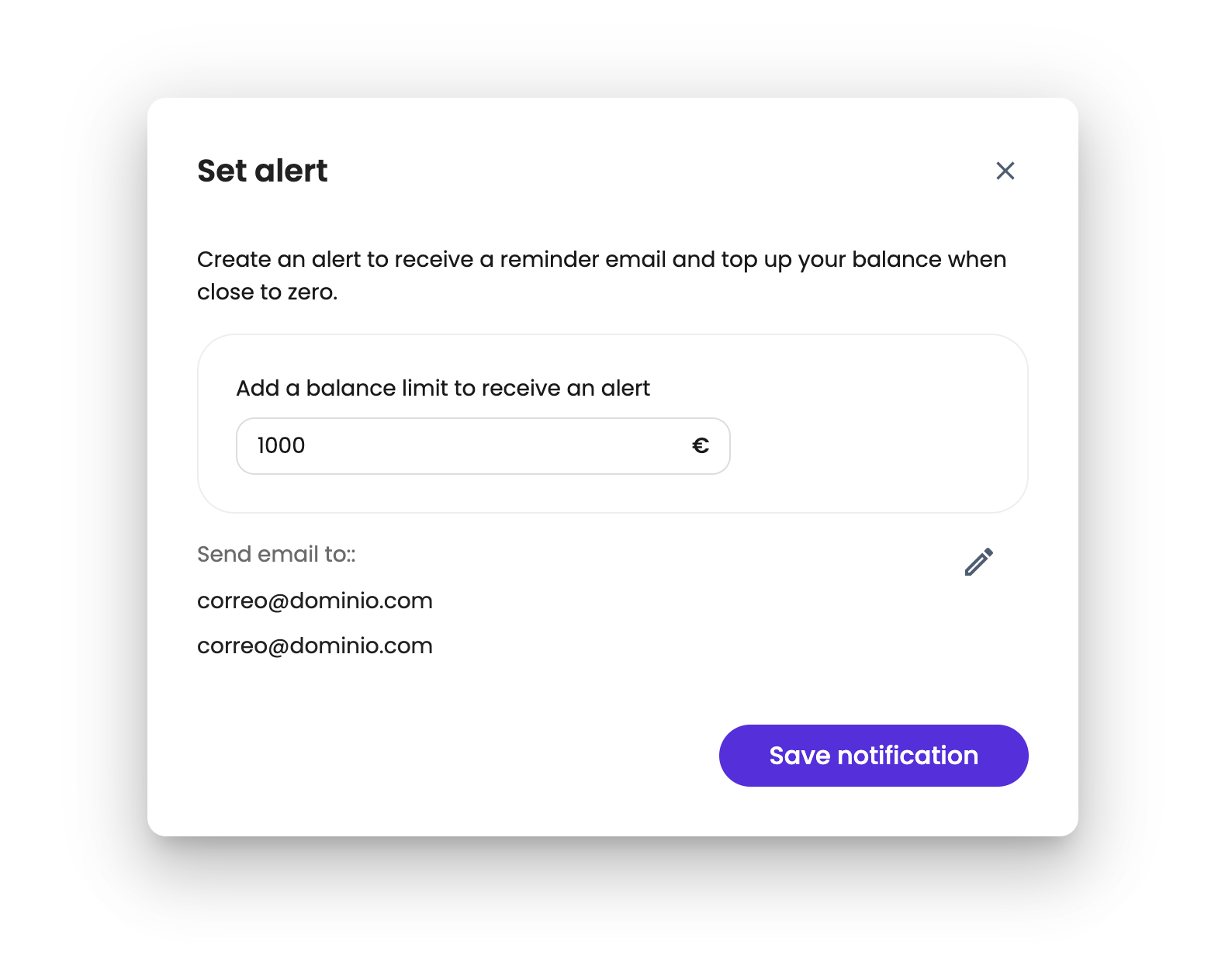 | 💡 We usually recommend setting the alert at 35% of the total of these factors. For example, if your monthly expenses are €1,000 and your Cobee fee is €100, we suggest setting the alert at €385 (€1,100 * 0.35 = €385). |