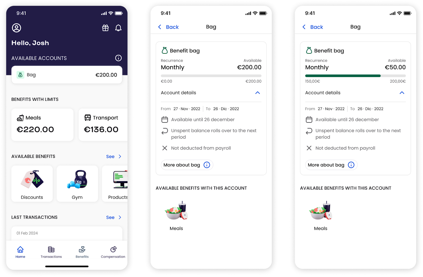 A benefit bag is a digital wallet where an amount is made available to the employee to spend on specific benefits (like food, transport, etc.), without an immediate transfer from the company’s account.