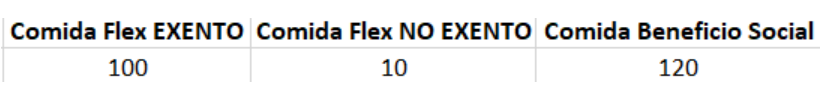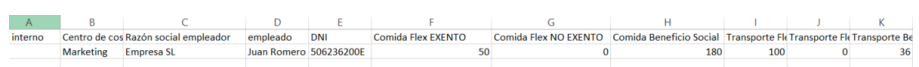 Por ejemplo, un consumo en retribución flexible de 100 euros en comidas irá en la columna correspondiente de nombre “Comida Flex Exento”