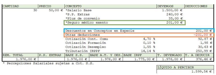Se crea así la fila Descuento en conceptos en especie dentro ahora de la columna de deducciones. (en azul en la imagen)