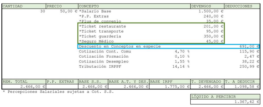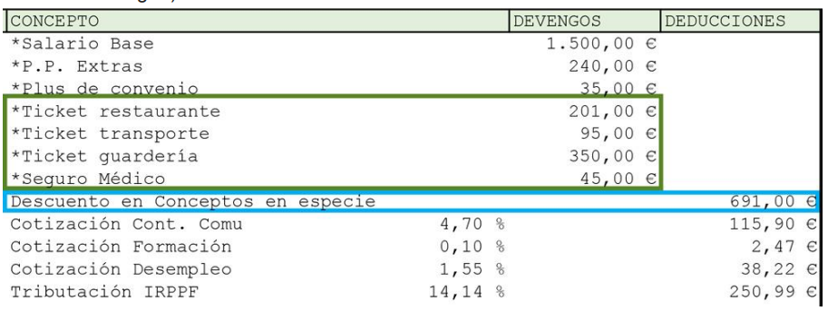 En este caso, indica que es retribución en especie en la nómina y en los devengos como valor en especie (en verde en la imagen). Lo que permitirá la cotización a la seguridad social.