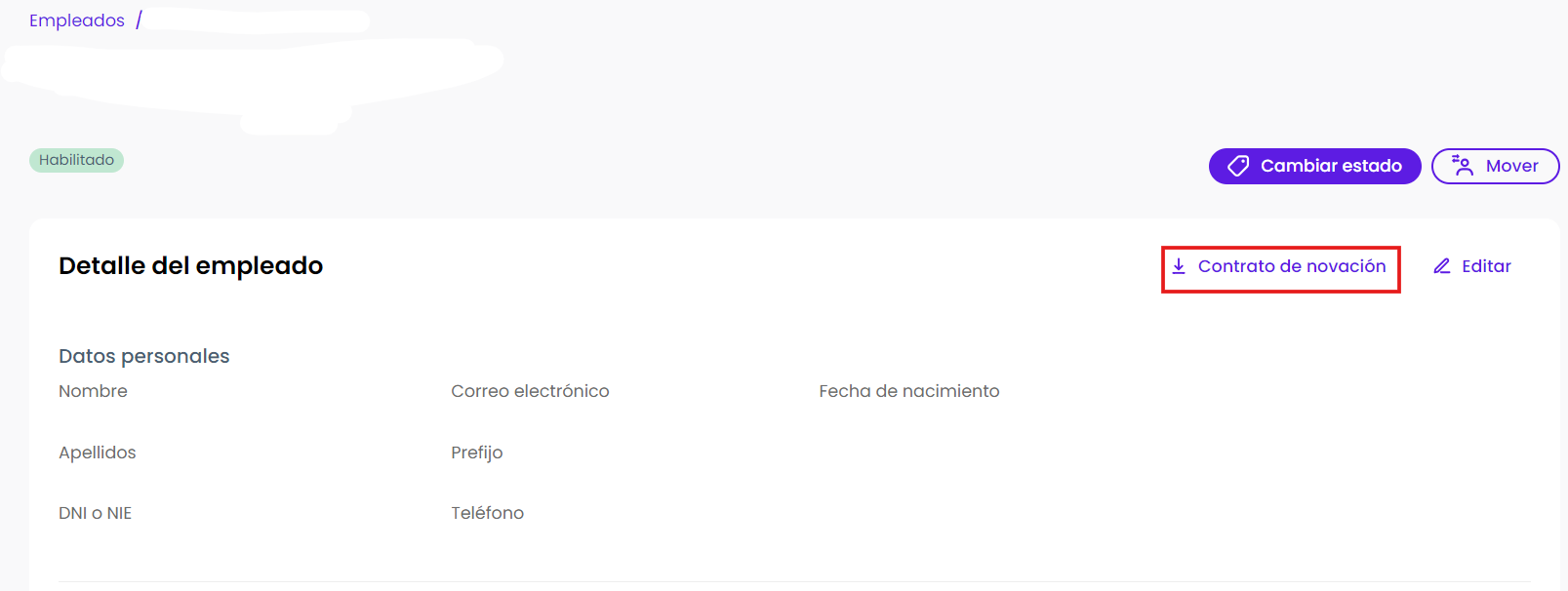 1. Debes acceder al perfil del empleado que deseas y luego hacer clic en "contrato de novación" dentro de su perfil. Podrás descargarlo en cualquier momento que desees.