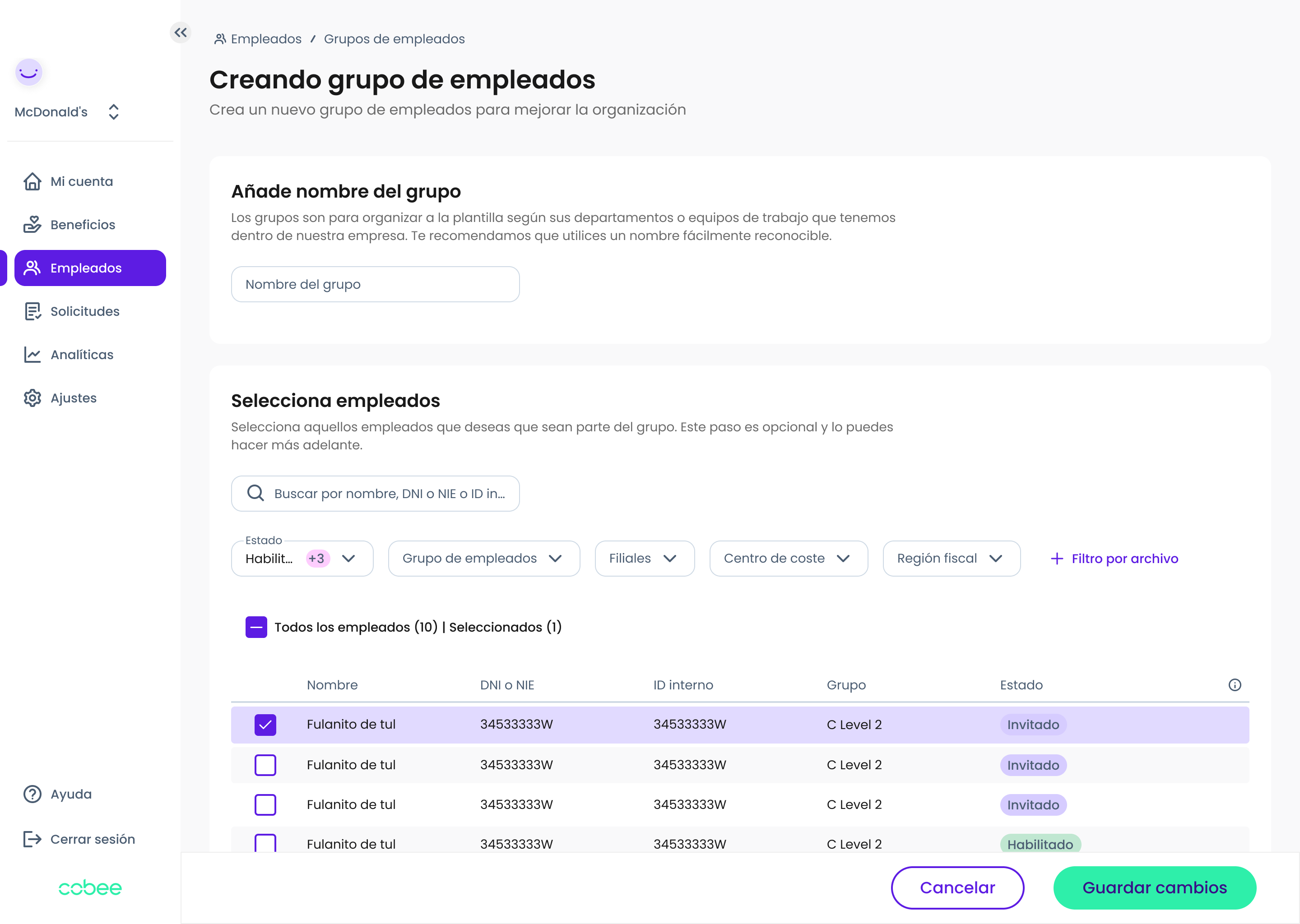 Una vez que le des a guardar cambios, se creará tu nuevo grupo de empleados y estarás listo para empezar a gestionar sus beneficios desde la pantalla de "Beneficios".