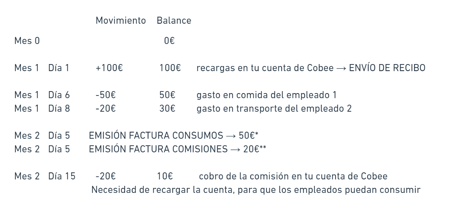 A continuación, incluimos un ejemplo de cómo el dinero se mueve dentro de vuestra cuenta en Cobee.