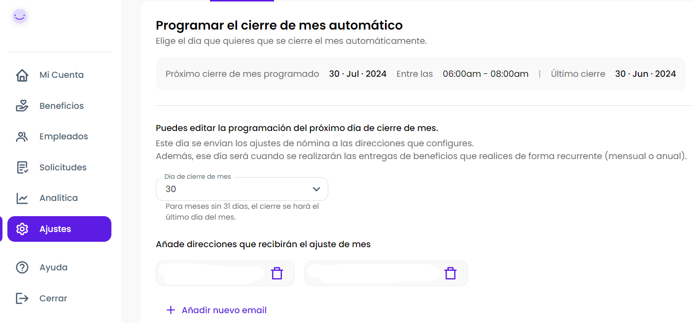 Desde la plataforma de la empresa, en el apartado de Ajustes - Ajustes, en la opción de "Añade direcciones que recibirán el ajuste de mes" puedes añadir o remover los correos de las personas que desean recibir el fichero de consumos.