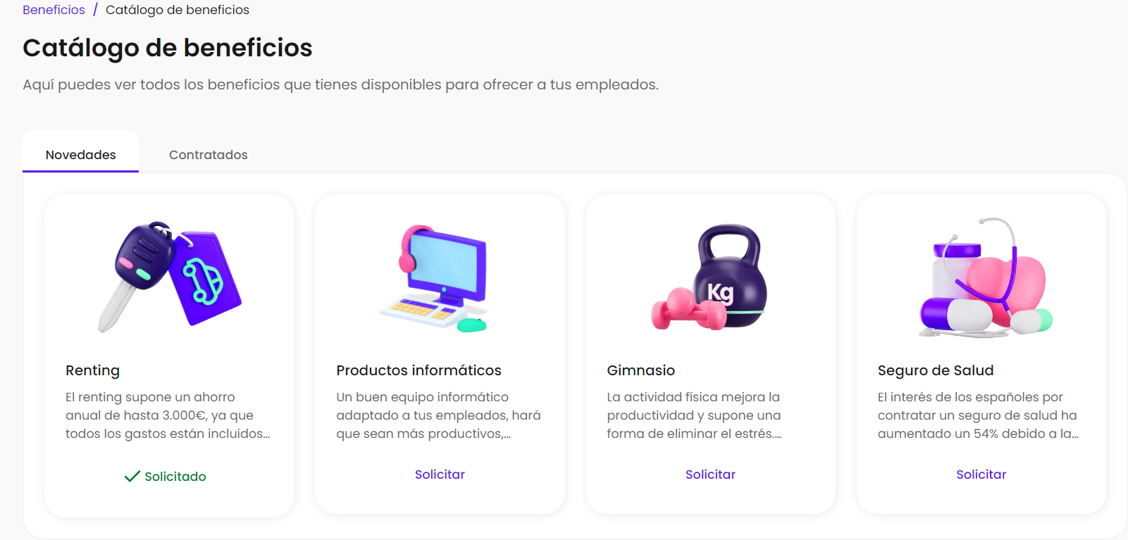 Desde el apartado de beneficios encontrarás el catálogo de beneficios desde este apartado podrás encontrar la sección de novedades en el cual podrás contratar o solicitar desde esta sección los beneficios disponibles para los empleados, y en la sección de contratados podrás encontrar los beneficios que tienes actualmente activos en tu empresa para los empleados, adicionalmente podrás seleccionar cada beneficio para conocer su funcionamiento y sus características.