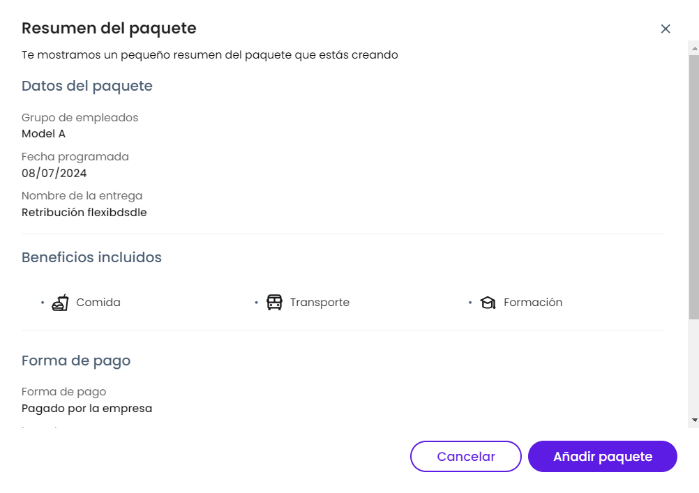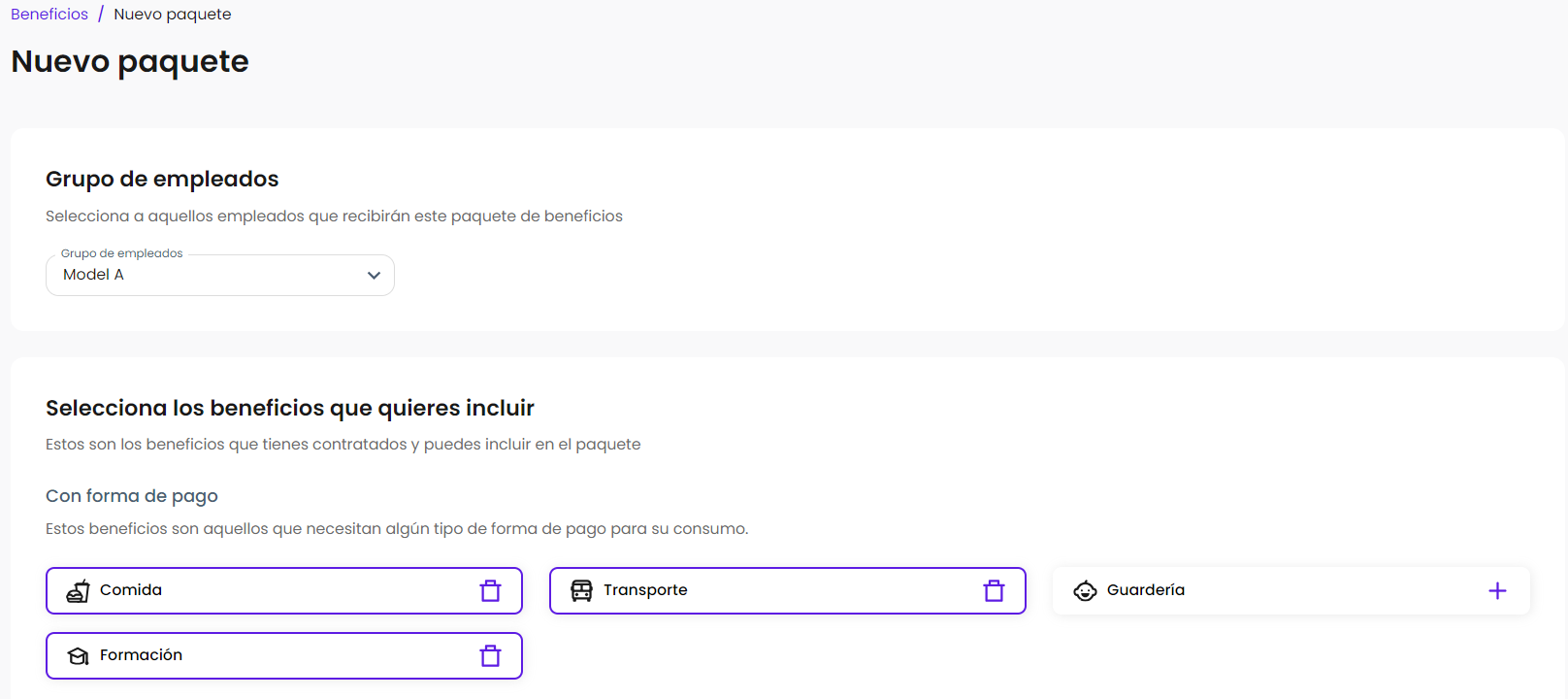 Un paquete de beneficios es una entrega de uno o más beneficios. En esta nueva experiencia, a medida que vas configurando los paquetes, el sistema te irá preguntando que configuraciones deseas agregar en cada paquete para asegurarnos de que al finalizar el proceso el paquete se haya creado con todos los requerimientos necesarios para realizar las entregas de manera exitosa.
